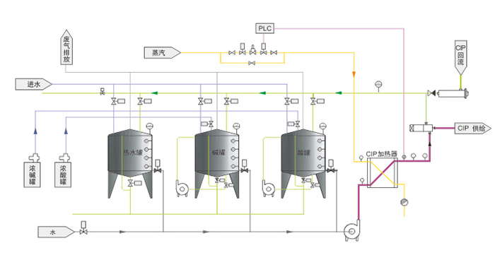 系統可單獨進行酸洗、堿洗、熱水沖洗等工序,也可根據需要編制特定的清洗程序進行全自動的清洗;不僅能有效的將設備清洗干凈,而且還能控制微生物生長;同時可根據客戶要求配置半自動和全自動控制系統。