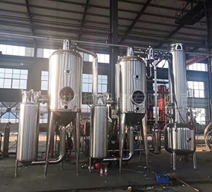 雙效濃縮器采用外加熱自然循環(huán)與真空負壓方式,蒸發(fā)速度快,濃縮比重大。液料在全密封中無泡沫濃縮,用本設備濃縮出來的藥液,具有無污染,藥味濃。清洗方便。